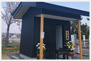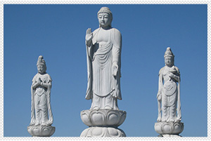 洞泉寺阿弥陀三尊像は無垢の石材で建立され、台座は納骨堂となっております。 阿弥陀様を中心に向かって右側に観音菩薩(かんのんぼさつ)、左側に勢至菩薩(せいしぼさつ)がいらっしゃり、阿弥陀様と共に我々をお救いくださいます。阿弥陀様の右手の形は、人々に「恐れなくてよい」という意味を現し、左手の形は「人々の願いを聞きましょう」とする形を表現しております。